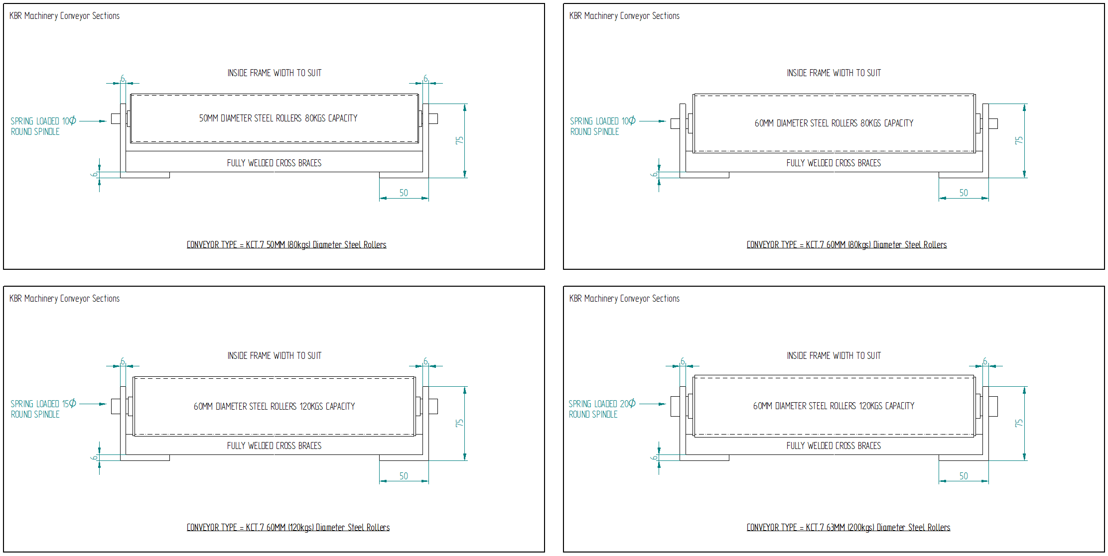 Standard rollers 50mm Ø & 60mm Ø with a heavier duty 63mm Ø available. Rollers can handle weights of up to 2000kgs per meter with specific roller centers.